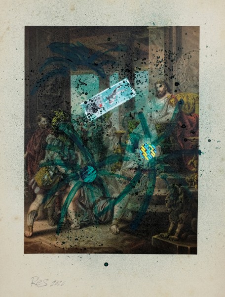 Technika: tuš, akryl, vlepky, papír s chromolitografickým tiskem